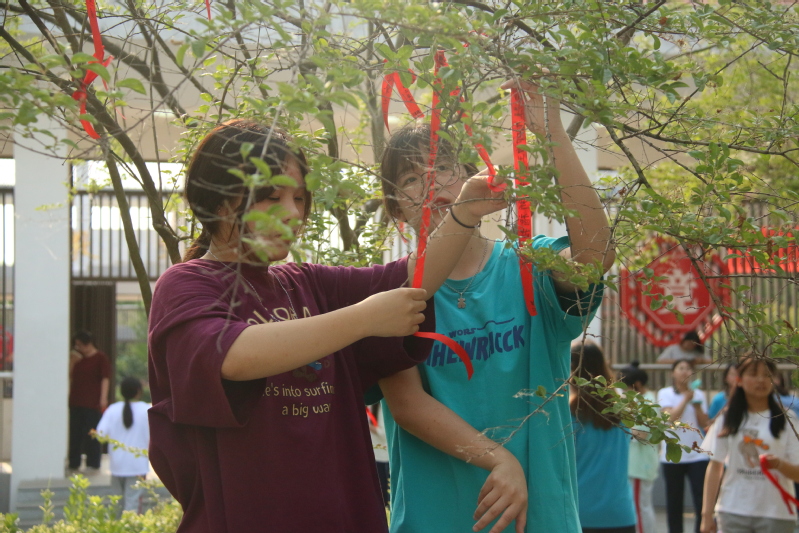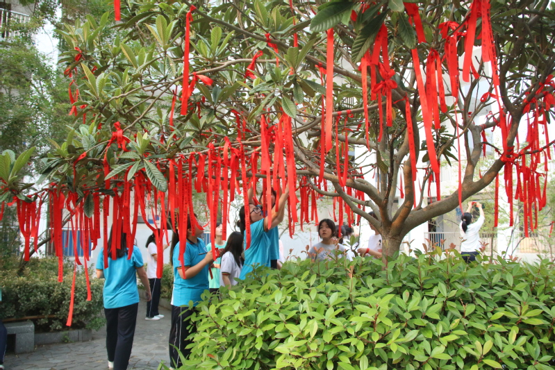 为弘扬新时代文明实践精神,营造良好的传统节日气氛,6月10日下午,风云策略网游戏论坛团委开展了端午节红丝带许愿活动。同学们纷纷将代表自己祝福和愿望的红丝带系在树上。