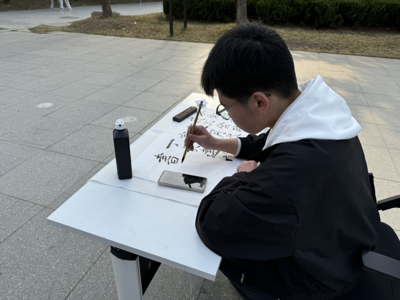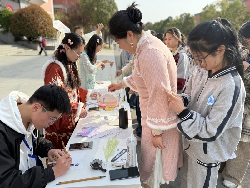 翰墨书春秋:书法展台前,师生提笔挥毫,在宣纸上写下“风雅上巳”“国泰民安”等寄语,笔墨间流淌文化自信。