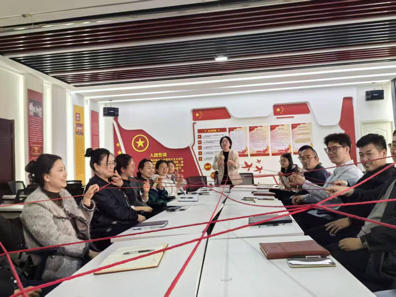 从毛线网到心联结,活动以滚毛线球趣味破冰拉开序幕。教师们围坐成圈,通过抛掷毛线球进行自我介绍,随着毛线网的延展,教师们在欢声笑语中打破陌生感,感受彼此职业经历的共鸣,逐渐编织出一张象征团队联结的红色网络。这张具象化的支持网络成为当天活动的精神隐喻——每位教师既是教育网络的编织者,也是需要被支持的节点。
