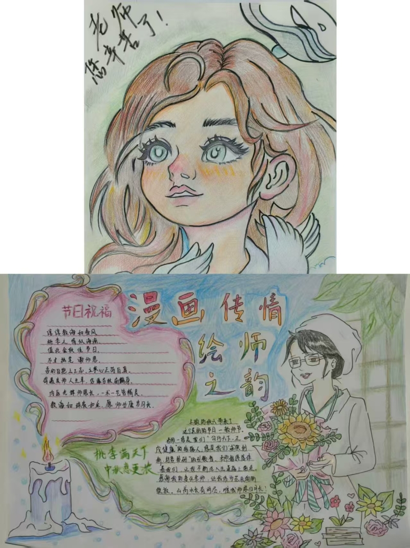 学生以“我眼中的老师”为主体进行教师漫画形象创作,用画笔捕捉教师们的形象特征与教学风采。每一幅作品不仅是对老师外形的描绘,更融入了学生对教师人格魅力的真实感知,展现出温暖而个性化的师生情感联结。