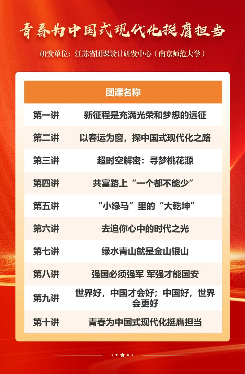 为引导广大团员和青年用党的创新理论武装头脑,团中央基层建设部聚焦“青春为中国式现代化挺膺担当”主题,指导江苏省团课设计研发中心(南京师范大学)推出了系列中学团课(10讲,含讲稿和课件),供基层团组织开展专题学习时参考使用。