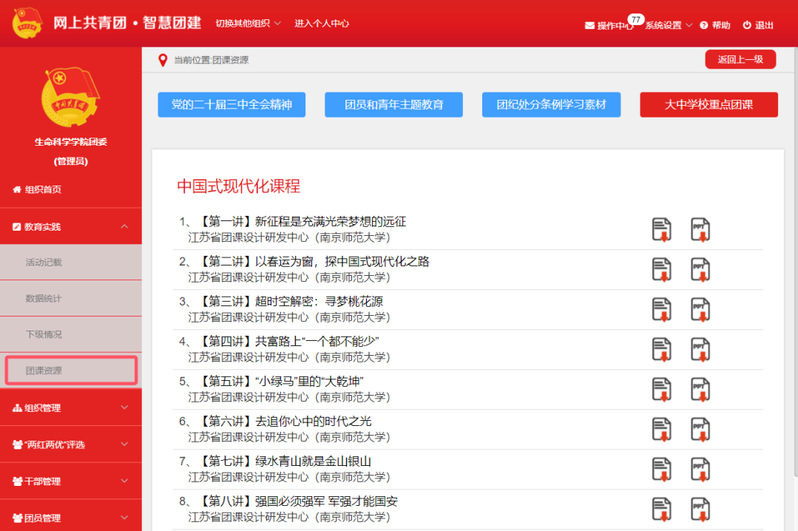 基层团组织书记可登录“智慧团建”系统,在管理中心“团课资源-大中学校重点团课”专区下载“青春为中国式现代化挺膺担当”专题学习资源。