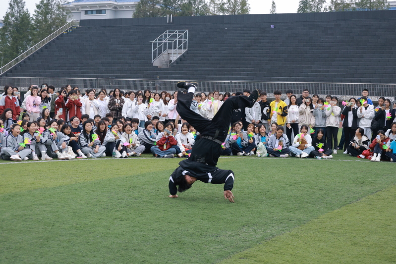 活动现场,突如其来的“快闪”表演瞬间吸引了过往师生的目光,大家纷纷驻足观看,随着曲库中随机播放的音乐即兴舞动,台下观众则化身啦啦队。舞者们或灵动跳跃,或默契配合,将现代舞的动感与青春的朝气展现得淋漓尽致。“太惊喜了!原本只是路过操场,没想到被这活力满满的舞蹈‘圈粉’了!”2024级中医康复班的王梓雯笑着说,不由自主地跟着节奏挥动双手。来自2024级护理4班的翁莎莎凭借日常的舞蹈基础完成了精彩表演,赢得了全场喝彩。