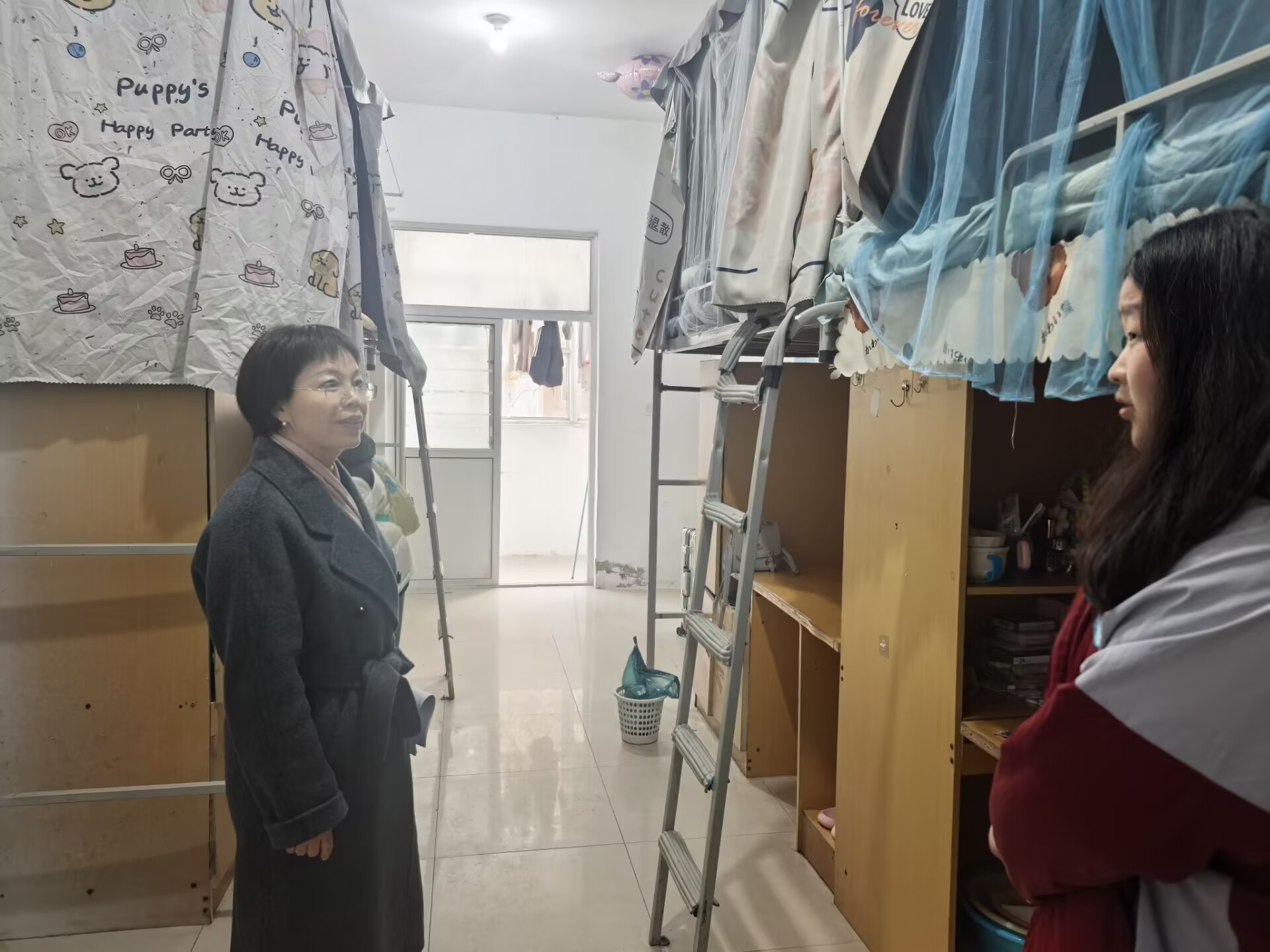 陈新颖则重点查看了宿舍的设施条件与日常环境,并与在场班主任深入交流宿舍管理细节。她强调,要坚持“以生为本”,将人身安全摆在首位,通过教育引导促进学生自觉维护环境卫生、整理内务,实现宿舍管理的精细化、常态化,共同营造整洁、文明、安全的生活空间。
